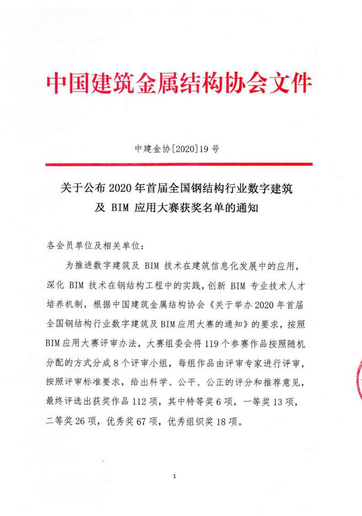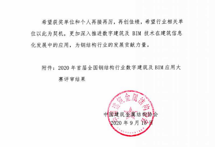 本次大賽由中國建筑金屬結(jié)構(gòu)協(xié)會鋼結(jié)構(gòu)分會承辦,旨在推進數(shù)字建筑及BIM技術(shù)在建筑信息化發(fā)展中的應用,深化BIM技術(shù)在鋼結(jié)構(gòu)工程中的實踐,創(chuàng)新BIM專業(yè)技術(shù)人才培養(yǎng)機制。大賽對于提高我國建筑業(yè)建筑信息模型技術(shù)的應用水平,實現(xiàn)真正意義上轉(zhuǎn)型升級,提升工程質(zhì)量和效率、降低造價和節(jié)約資源,推動技術(shù)創(chuàng)新、質(zhì)量創(chuàng)優(yōu)和人才隊伍建設有著積極的推進作用。同時相信隨著BIM應用的進一步展開,我公司的裝配式建筑發(fā)展將如虎添翼,我司 BIM團隊會取得更加優(yōu)異的成績!