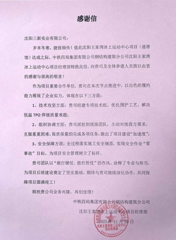 日前,中鐵四局項(xiàng)目部的感謝信跨越金秋而來(lái),字里行間滿是對(duì)三新的敬意:“技術(shù)攻堅(jiān)破局、組織協(xié)調(diào)高效、安全保障扎實(shí),以‘三新力量’為場(chǎng)館如期封閉筑牢根基?!?/span>這紙贊譽(yù)背后,是汗水與堅(jiān)守的沉淀,更是對(duì)東北建筑鐵軍匠心與實(shí)力的最佳詮釋。