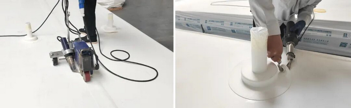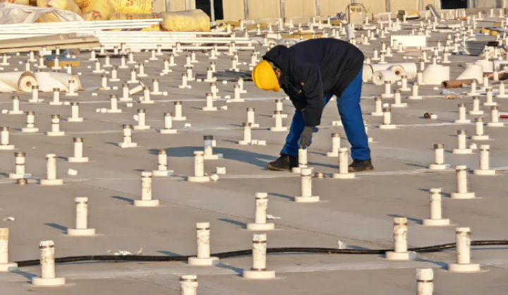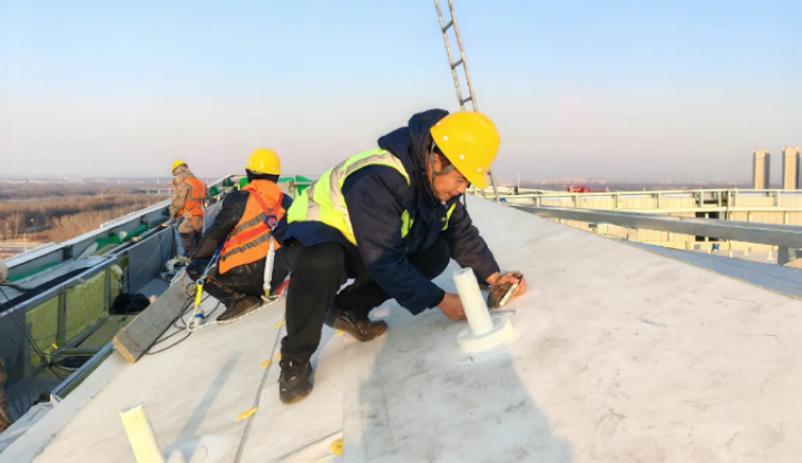 東北的冬季是最大考驗(yàn)。三新專項(xiàng)技術(shù)組優(yōu)化圍護(hù)工藝,攻克低溫TPO 焊接難題;排水天溝內(nèi)置精準(zhǔn)電伴熱系統(tǒng),杜絕凍堵風(fēng)險(xiǎn);光伏支架立桿采用高分子包封件,實(shí)現(xiàn)防水與發(fā)電的無(wú)縫銜接。當(dāng)抗風(fēng)揭試驗(yàn)室的模擬狂風(fēng)掠過(guò)屋面,這頂 “鳳冠” 用數(shù)據(jù)證明:它不僅是建筑的外衣,更是自然的摯友。